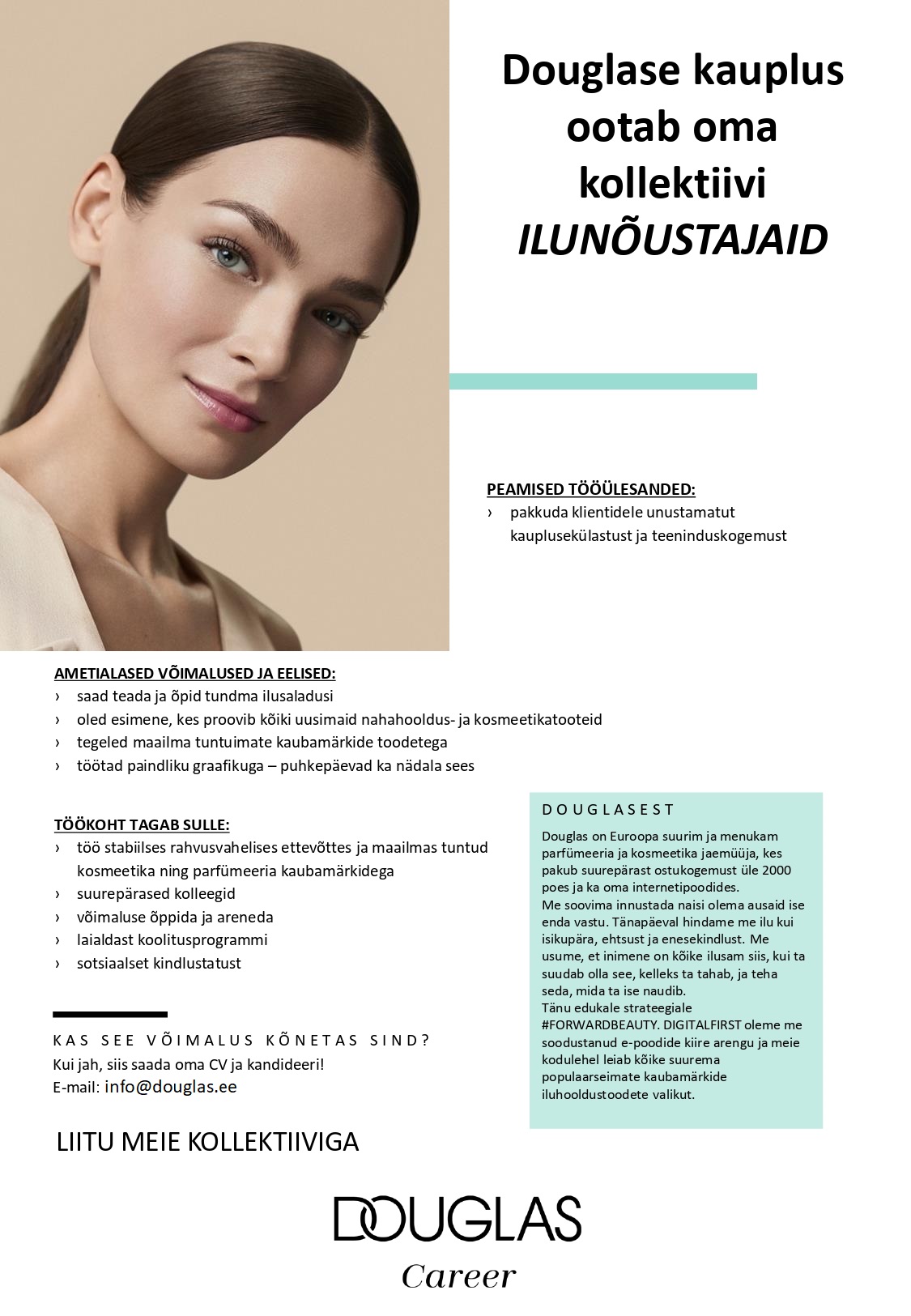 SIA Douglas Latvia kinnitab, et Sinu CV-s ja motivatsioonikirjas esitatud isikuandmeid töödeldakse Sinu sobivuse hindamiseks vabale töökohale ning Sinu isikuandmeid säilitatakse vaid volitatud isikutele kättesaadavas kohas.