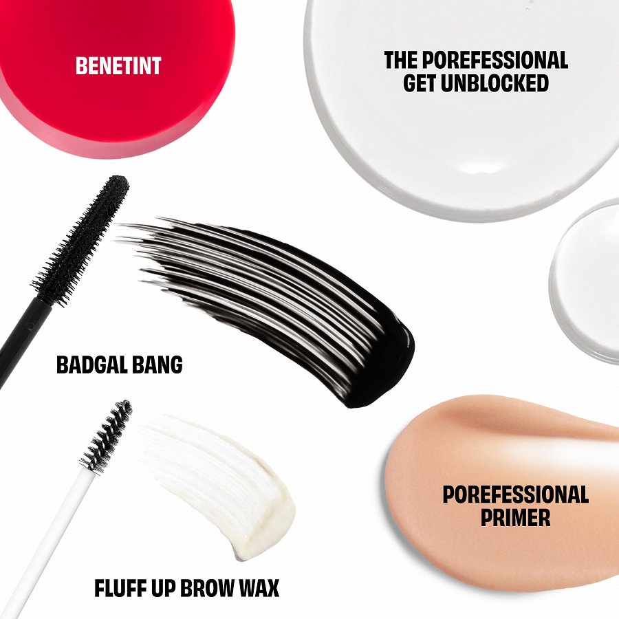 BADGAL BANG MASCARA : AQUA (WATER), PARAFFIN, CERA ALBA (BEESWAX), GLYCERYL STEARATE, BUTYLENE GLYCOL, ACRYLATES COPOLYMER, EUPHORBIA CERIFERA (CANDELILLA) WAX, COPERNICIA CERIFERA (CARNAUBA) WAX, POLYBUTENE, STEARETH-21, VP/EICOSENE COPOLYMER, PALMITIC ACID, STEARIC ACID, PHENOXYETHANOL, STEARETH-2, AMINOMETHYL PROPANEDIOL, PANTHENOL, CAPRYLYL GLYCOL, HYDROXYETHYLCELLULOSE, SILICA SILYLATE, TOCOPHERYL ACETATE, NYLON-12, BHT. [+/-: CI 19140 (YELLOW 5, YELLOW 5 LAKE), CI 42090 (BLUE 1 LAKE), CI 77007 (ULTRAMARINES), CI 77163 (BISMUTH OXYCHLORIDE), CI 77288 (CHROMIUM OXIDE GREENS), CI 77289 (CHROMIUM HYDROXIDE GREEN), CI 77491, CI 77492, CI 77499 (IRON OXIDES), CI 77510 (FERRIC FERROCYANIDE, FERRIC AMMONIUM FERROCYANIDE), CI 77742 (MANGANESE VIOLET), CI 77891 (TITANIUM DIOXIDE)]. N° 11535/A BENETINT : AQUA (WATER), BUTYLENE GLYCOL, GLYCERIN, POLYSORBATE 20, SODIUM DEHYDROACETATE, HYDROXYACETOPHENONE, 1,2-HEXANEDIOL, CAPRYLYL GLYCOL, PARFUM (FRAGRANCE), SODIUM HYDROXIDE, TETRASODIUM EDTA, MALTODEXTRIN, CITRIC ACID, GERANIOL, CITRONELLOL, LINALOOL, HEXYL CINNAMAL. [+/- CI 75470 (CARMINE)]. N° 19584 . FLUFF UP BROW WAX : AQUA (WATER), SYNTHETIC CANDELILLA WAX, STEARETH-21, GLYCERYL STEARATE, BUTYLENE GLYCOL, ACACIA SENEGAL GUM, BUTYROSPERMUM PARKII (SHEA) BUTTER, CELLULOSE, SILICA, SIMMONDSIA CHINENSIS (JOJOBA) SEED OIL, DIMER DILINOLEYL DIMER DILINOLEATE, CERA CARNAUBA (COPERNICIA CERIFERA (CARNAUBA) WAX), ARGANIA SPINOSA KERNEL OIL, CETYL ALCOHOL, POLYGLYCERYL-10 MYRISTATE, ORYZA SATIVA (RICE) STARCH, PHENOXYETHANOL, CAPRYLYL GLYCOL, SODIUM BENZOATE, POTASSIUM SORBATE, ARGININE, TOCOPHEROL, CHONDRUS CRISPUS POWDER, DIMETHICONE. N° 17124 PRODUCT THE POREFESSIONAL PRIMER : CYCLOPENTASILOXANE, DIMETHICONE, DIMETHICONE/VINYL DIMETHICONE CROSSPOLYMER, ISONONYL ISONONANOATE, SILICA, DIMETHICONE CROSSPOLYMER, ISODODECANE, PHENOXYETHANOL, POLYMETHYL METHACRYLATE, TITANIUM DIOXIDE (CI 77891), CYCLOHEXASILOXANE, TOCOPHERYL ACETATE, FRAGRANCE (PARFUM), MICA, IRON OXIDES (CI 77492), LIMONENE, IRON OXIDES (CI 77491), IRON OXIDES (CI 77499), TRIETHOXYCAPRYLYLSILANE, BHT. N° 04932/N THE POREFESSIONAL GET UNBLOCKED : CAPRYLIC/CAPRIC TRIGLYCERIDE, SIMMONDSIA CHINENSIS (JOJOBA) SEED OIL, PEG-40 SORBITAN PEROLEATE, PERSEA GRATISSIMA (AVOCADO) OIL, VITIS VINIFERA (GRAPE) SEED OIL, 1,2-HEXANEDIOL, CAPRYLYL GLYCOL, PARFUM (FRAGRANCE), BISABOLOL, PRUNUS DOMESTICA SEED OIL, TRIETHYL CITRATE, TOCOPHEROL, CERAMIDE NP, TOCOPHERYL ACETATE, PENTAERYTHRITYL TETRA-DI-T-BUTYL HYDROXYHYDROCINNAMATE. N° 17004 DISCLAMER: PRODUCT INGREDIENT LISTINGS ARE UPDATED PERIODICALLY. BEFORE USING A BENEFIT PRODUCT, PLEASE READ THE INGREDIENT LIST ON THE PACKAGING OF YOUR PRODUCT TO BE SURE THAT THE INGREDIENTS ARE APPROPRIATE FOR YOUR PERSONAL USE.