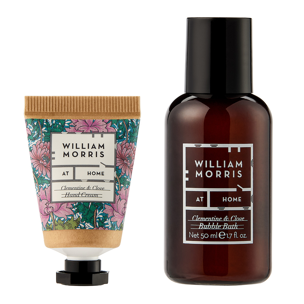 WILLIAM MORRIS AT HOME CLEMENTINE & CLOVE HAND CREAM INGREDIENTS: AQUA/WATER/EAU, CETEARYL ALCOHOL, CAPRYLIC/CAPRIC TRIGLYCERIDE, GLYCERIN, CETEARETH-25, THEOBROMA CACAO (COCOA) SEED BUTTER, BUTYROSPERMUM PARKII (SHEA) BUTTER, SIMMONDSIA CHINENSIS (JOJOBA) SEED OIL, MACADAMIA TERNIFOLIA SEED OIL, CETEARETH-6, PHENOXYETHANOL, PARFUM (FRAGRANCE), ALLANTOIN, DISODIUM EDTA, TOCOPHERYL ACETATE (VITAMIN E), CHLORPHENESIN, CITRUS AURANTIUM DULCIS (ORANGE) FRUIT EXTRACT, BUTYLENE GLYCOL, HYDROXYACETOPHENONE, EUGENIA CARYOPHYLLUS (CLOVE) LEAF OIL, CITRUS AURANTIUM DULCIS (ORANGE) OIL, EUGENOL, LIMONENE, CINNAMAL, COUMARIN. WILLIAM MORRIS AT HOME CLEMENTINE & CLOVE BUBBLE BATH INGREDIENTS: AQUA/WATER/EAU, COCAMIDOPROPYL BETAINE, GLYCERETH-26, SODIUM LAUROYL SARCOSINATE, DISODIUM COCOAMPHODIACETATE, PARFUM (FRAGRANCE), PHENOXYETHANOL, DISODIUM LAURETH SULFOSUCCINATE, PEG-120 METHYL GLUCOSE DIOLEATE, OLIVE OIL PEG-7 ESTERS, SODIUM CHLORIDE, CITRIC ACID, DISODIUM EDTA, CHLORPHENESIN, CITRUS AURANTIUM DULCIS (ORANGE) FRUIT EXTRACT, TOCOPHERYL ACETATE (VITAMIN E), BUTYLENE GLYCOL, HYDROXYACETOPHENONE, EUGENIA CARYOPHYLLUS (CLOVE) LEAF OIL, CITRUS AURANTIUM DULCIS (ORANGE) OIL, EUGENOL, LIMONENE, CINNAMAL, COUMARIN.