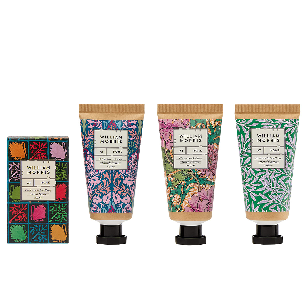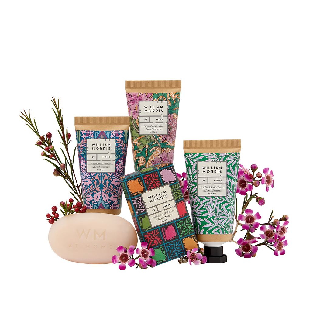 WILLIAM MORRIS AT HOME CLEMENTINE & CLOVE HAND CREAM INGREDIENTS: AQUA/WATER/EAU, CETEARYL ALCOHOL, CAPRYLIC/CAPRIC TRIGLYCERIDE, GLYCERIN, CETEARETH-25, THEOBROMA CACAO (COCOA) SEED BUTTER, BUTYROSPERMUM PARKII (SHEA) BUTTER, SIMMONDSIA CHINENSIS (JOJOBA) SEED OIL, MACADAMIA TERNIFOLIA SEED OIL, CETEARETH-6, PHENOXYETHANOL, PARFUM (FRAGRANCE), ALLANTOIN, DISODIUM EDTA, TOCOPHERYL ACETATE (VITAMIN E), CHLORPHENESIN, CITRUS AURANTIUM DULCIS (ORANGE) FRUIT EXTRACT, BUTYLENE GLYCOL, HYDROXYACETOPHENONE, EUGENIA CARYOPHYLLUS (CLOVE) LEAF OIL, CITRUS AURANTIUM DULCIS (ORANGE) OIL, EUGENOL, LIMONENE, CINNAMAL, COUMARIN. WILLIAM MORRIS AT HOME PATCHOULI & RED BERRY GUEST SOAP INGREDIENTS: SODIUM PALM KERNELATE,* SODIUM PALMATE,* AQUA/WATER/EAU, GLYCERIN, PARFUM (FRAGRANCE), SODIUM CHLORIDE, TETRASODIUM EDTA, TOCOPHERYL ACETATE (VITAMIN E), CI77891 (TITANIUM DIOXIDE), PANTHENOL (PRO-VITAMIN B5), BUTYLENE GLYCOL, CITRUS AURANTIUM DULCIS (ORANGE) FRUIT EXTRACT, FRAGARIA ANANASSA (STRAWBERRY) FRUIT EXTRACT, HYDROXYACETOPHENONE, POGOSTEMON CABLIN (PATCHOULI) OIL, PIPER NIGRUM (BLACK PEPPER) SEED OIL, ELETTARIA CARDAMOMUM (CARDAMOM) SEED OIL, LINALOOL, ALPHA - ISOMETHYL IONONE. *RSPO CERTIFIED.