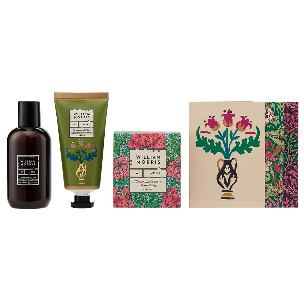 WILLIAM MORRIS AT HOME CLEMENTINE & CLOVE HAND & BODY CREAM INGREDIENTS: AQUA/WATER/EAU, CETEARYL ALCOHOL, CAPRYLIC/CAPRIC TRIGLYCERIDE, GLYCERIN, CETEARETH-25, THEOBROMA CACAO (COCOA) SEED BUTTER, BUTYROSPERMUM PARKII (SHEA) BUTTER, SIMMONDSIA CHINENSIS (JOJOBA) SEED OIL, MACADAMIA TERNIFOLIA SEED OIL, CETEARETH-6, PHENOXYETHANOL, PARFUM (FRAGRANCE), ALLANTOIN, DISODIUM EDTA, TOCOPHERYL ACETATE (VITAMIN E), CHLORPHENESIN, CITRUS AURANTIUM DULCIS (ORANGE) FRUIT EXTRACT, BUTYLENE GLYCOL, HYDROXYACETOPHENONE, EUGENIA CARYOPHYLLUS (CLOVE) LEAF OIL, CITRUS AURANTIUM DULCIS (ORANGE) OIL, EUGENOL, LIMONENE, CINNAMAL, COUMARIN. WILLIAM MORRIS AT HOME CLEMENTINE & CLOVE HAND & BODY WASH INGREDIENTS: AQUA/WATER/EAU, COCAMIDOPROPYL BETAINE, GLYCERETH-26, DISODIUM COCOAMPHODIACETATE, PARFUM (FRAGRANCE), SODIUM LAUROYL SARCOSINATE, PHENOXYETHANOL, DISODIUM LAURETH SULFOSUCCINATE, SODIUM CHLORIDE, OLIVE OIL PEG-7 ESTERS, CITRIC ACID, PEG-120 METHYL GLUCOSE DIOLEATE, DISODIUM EDTA, CHLORPHENESIN, TOCOPHERYL ACETATE (VITAMIN E), CITRUS AURANTIUM DULCIS (ORANGE) FRUIT EXTRACT, BUTYLENE GLYCOL, HYDROXYACETOPHENONE, EUGENIA CARYOPHYLLUS (CLOVE) LEAF OIL, CITRUS AURANTIUM DULCIS (ORANGE) OIL, EUGENOL, LIMONENE, CINNAMAL, COUMARIN. WILLIAM MORRIS AT HOME CLEMENTINE & CLOVE BATH SALTS SODIUM CHLORIDE, PARFUM (FRAGRANCE), EUGENIA CARYOPHYLLUS (CLOVE) LEAF OIL, CITRUS AURANTIUM DULCIS (ORANGE) OIL, EUGENOL, LIMONENE, CINNAMAL.