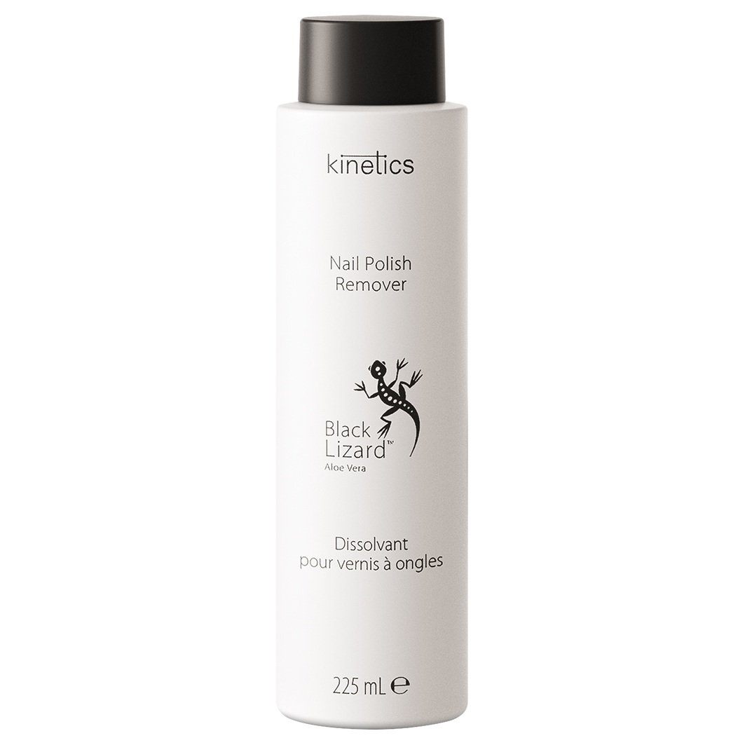 KINETICS Nail Polish Remover Black Lizard on professionaalne küünelakieemaldaja värske aloe vera lõhnaga, millel ei ole tugevat atsetoonilõhna. See sobib suurepäraselt tervetele küüntele ja geelidele ning mõjub koheselt, eemaldades isegi vana kuiva küünelaki.