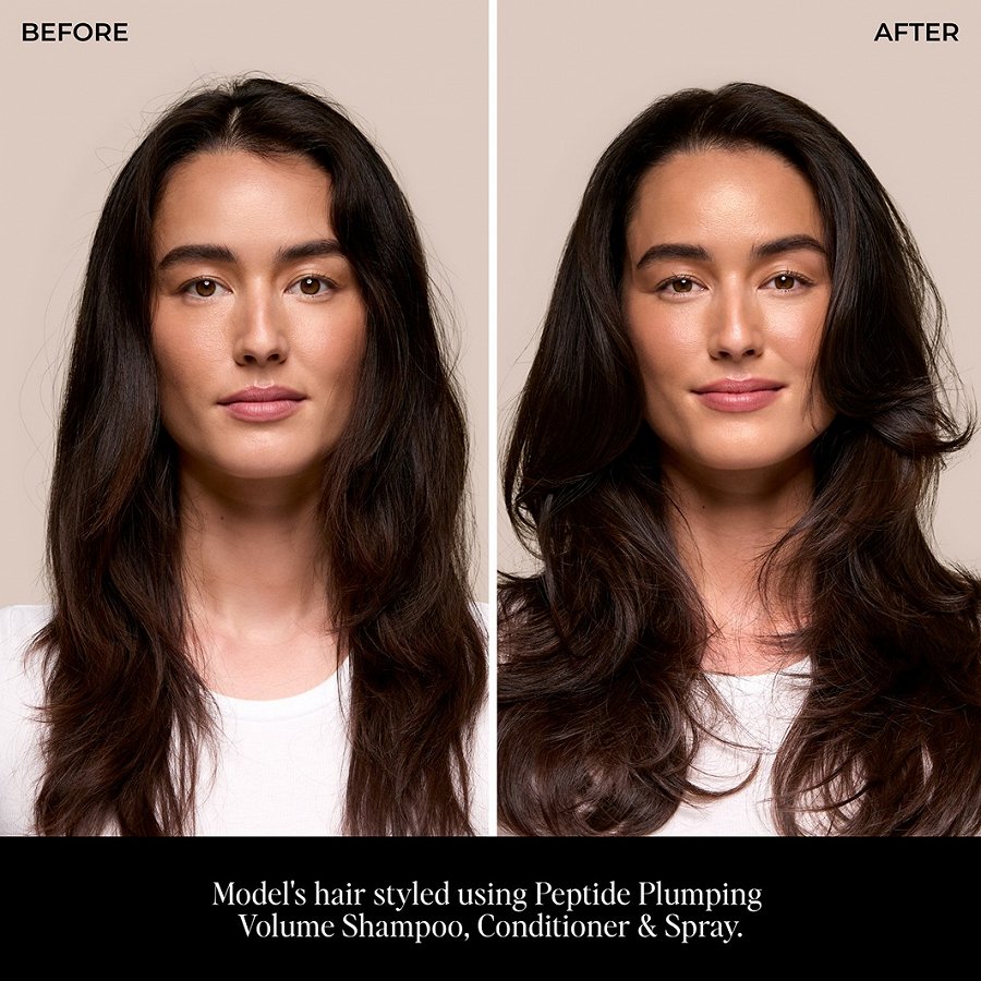 See õhukestele, lamedatele juustele loodud šampoon kasutab kliiniliselt tõestatud peptiide, et pakkuda pehmet, püsivat kohevust juurtest otsteni.