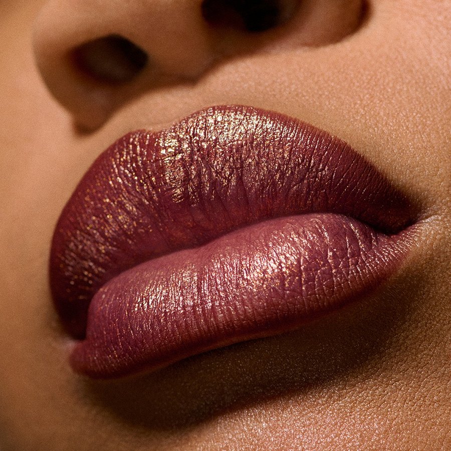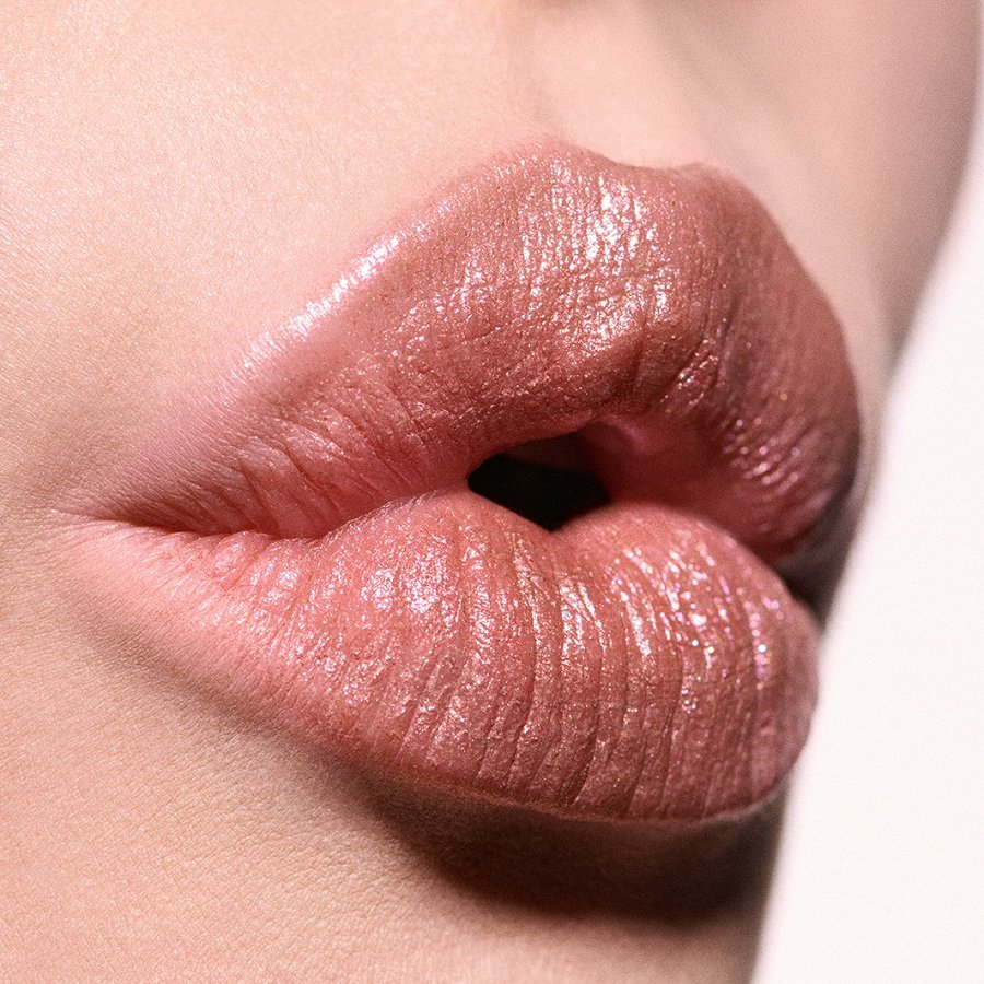 Huulepalsamit meenutava konsistentsiga siidine huulepulk, mis katab huuled küütleva metallikvärviga.