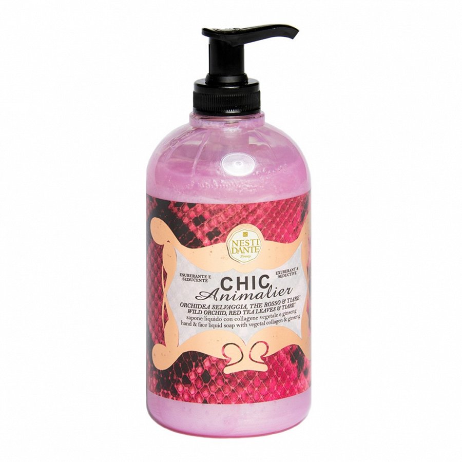 NESTI DANTE Chic Animalier Liquid Soap rahustav dušigeel, mis on rikastatud taimse kollageeni ja orgaanilise ženšennijuure ekstrakti antioksüdatiivsete omadustega. Üliküllusliku ja võrgutavana paiskub see veel avastamata lõhnade bukett laiali, ülistades metsikute orhideede lõhnaaktsente, päästes valla omamissoovi ning sisaldades lubadust särtsakateks öödeks, mil keegi ei maga. Ei sisalda parabeene.